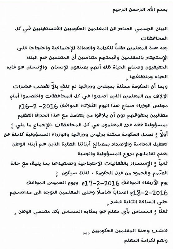 هذا وقد احتشد الالاف من المعلّمين اليوم في محافظة رام الله والبيرة مطالبين برحيل أمين عام تحاد المعلمين أحمد سحويل، وبتنفيذ القرارات التي أبرمت بين الاتحاد والحكومة الفلسطينية.