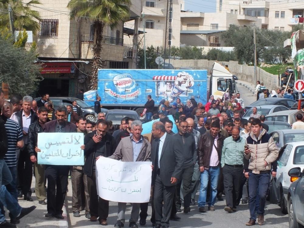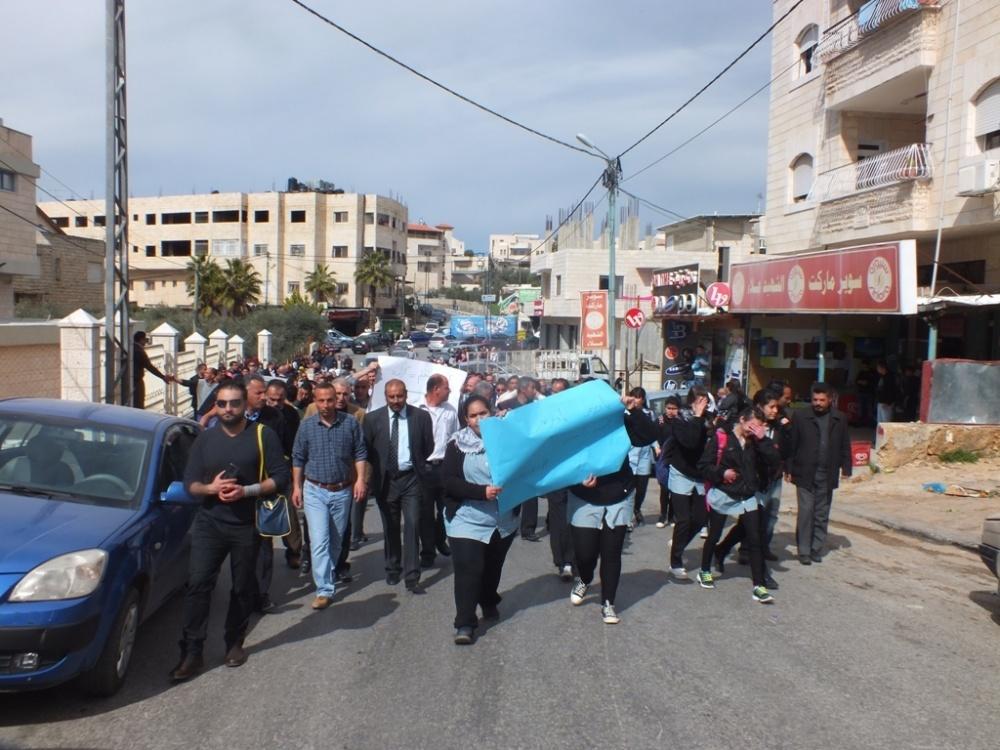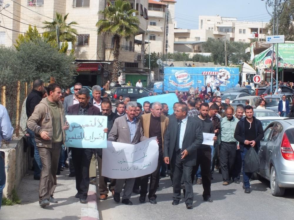 ونظمت اللجنة المشرفة على الفعاليات النقابية للمعلمين مسيرة شارك فيها مئات المعلمين وموظفي الترية والتعليم والطلبة انطلقت من ساحة التربية مرورا بالطريق الرئيسي بيت لحم – الخليل ، وباب الزقاق، وصولا الى ساحة السينما، حيث اقيم مهرجان حاشد دعما لمطالب المعلمين وحقوقهم النقابية والمهنية.