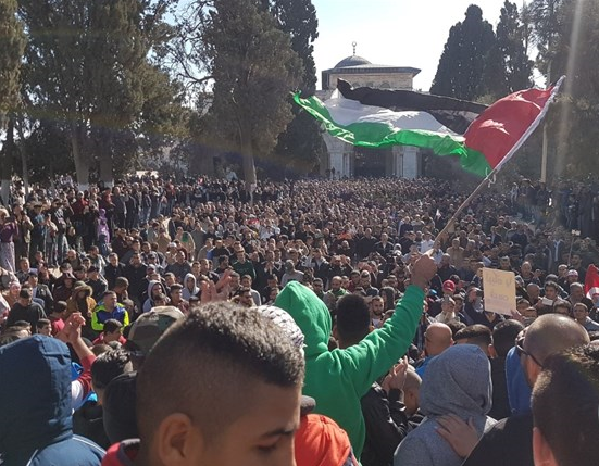 مظاهرة حاشدة جابت باحات الأقصى بدأت من ساحة المسجد القبلي ثم سارت باتجاه صحن قبة الصخرة وصولا الى باب المجلس والذي خرجت منه باتجاه البلدة القديمة.