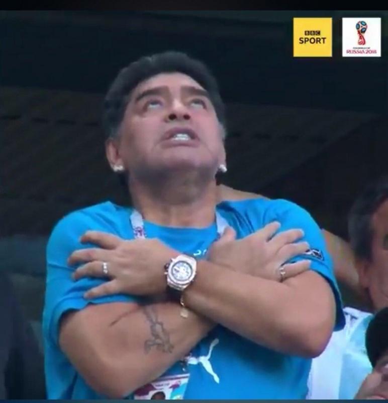 وعلى غرار المباراتين الأوليين للمنتخب في المجموعة الرابعة ضد آيسلندا (1-1) وكرواتيا (صفر-3)، كان مارادونا، الذي قاد الأرجنتين إلى لقبها العالمي الأخير عام 1986، حاضرا في المدرجات؛ لمؤازرة ليونيل ميسي ورفاقه، في المباراة المصيرية لمشوارهم في المونديال الروسي.