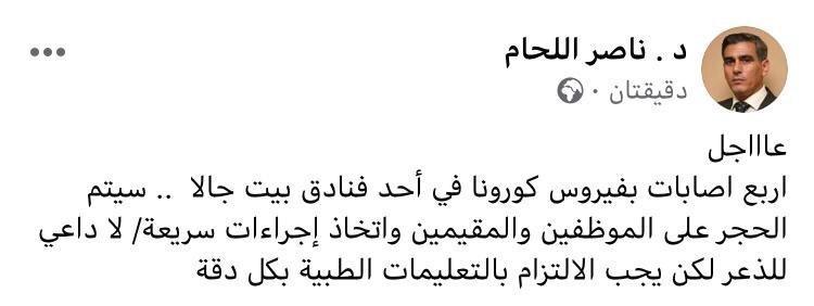 وتقرر الحجر الصحي على الموظفين والمقيمين واتخاذ إجراءات سريعة.