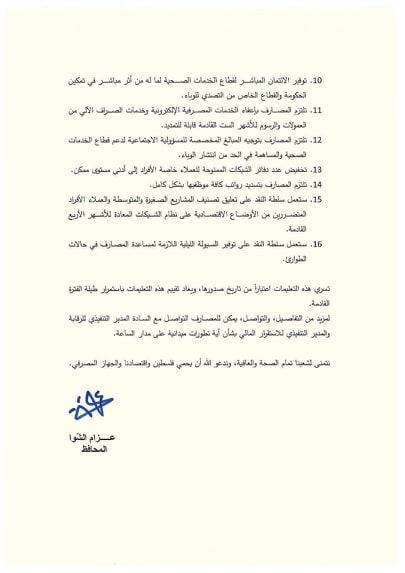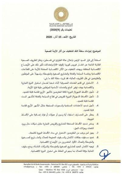 شبكة وتر-اتخذت سلطة النقد اجراءات بسبب الحالة الصحية نظرا لانتشار فيروس كورونا في فلسطين وعليه قررت تاجيل تسديد القروض الشهرية اربعة اشهر قابلة للتمديد.