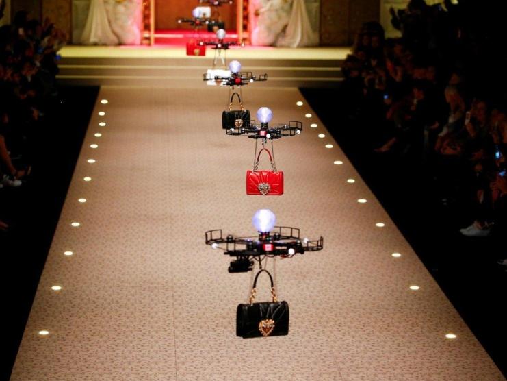 وفي مستهل العرض، فتحت البوابة لتخرج منها طائرات بدون طيار تحمل حقائب اليد النسائية الفاخرة للدار الشهيرة وتسير بها على الممشى.
